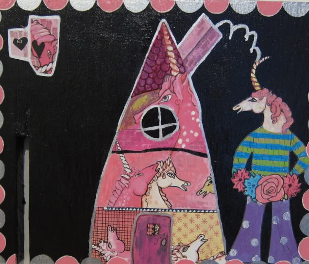 I am having a last minute one-time-only art auction! 50% of the proceeds go to the wonderful work of the TMI Project. Win this 10"x12" mixed media painting on reclaimed wood. It is from a 2010 series, modeling the artwork of children. This piece is inspired by a young Ruby Gunn. Unicorns unite to counteract negativity! The winner will be announced at noon on Friday, December 23. That's tomorrow!